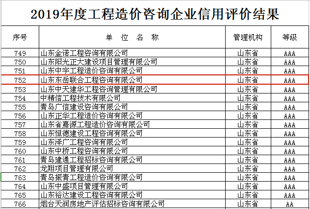 近日,2019年度工程造价咨询企业信用评价结果在中国建设工程造价管理协会网公示,经各省工程造价管理机构初评,中价协组织专家评审,山东东岳联合工程咨询有限公司被评定为2019年度全国工程造价咨询AAA级信用企业。我公司也是唯一一家泰安本土上榜企业。