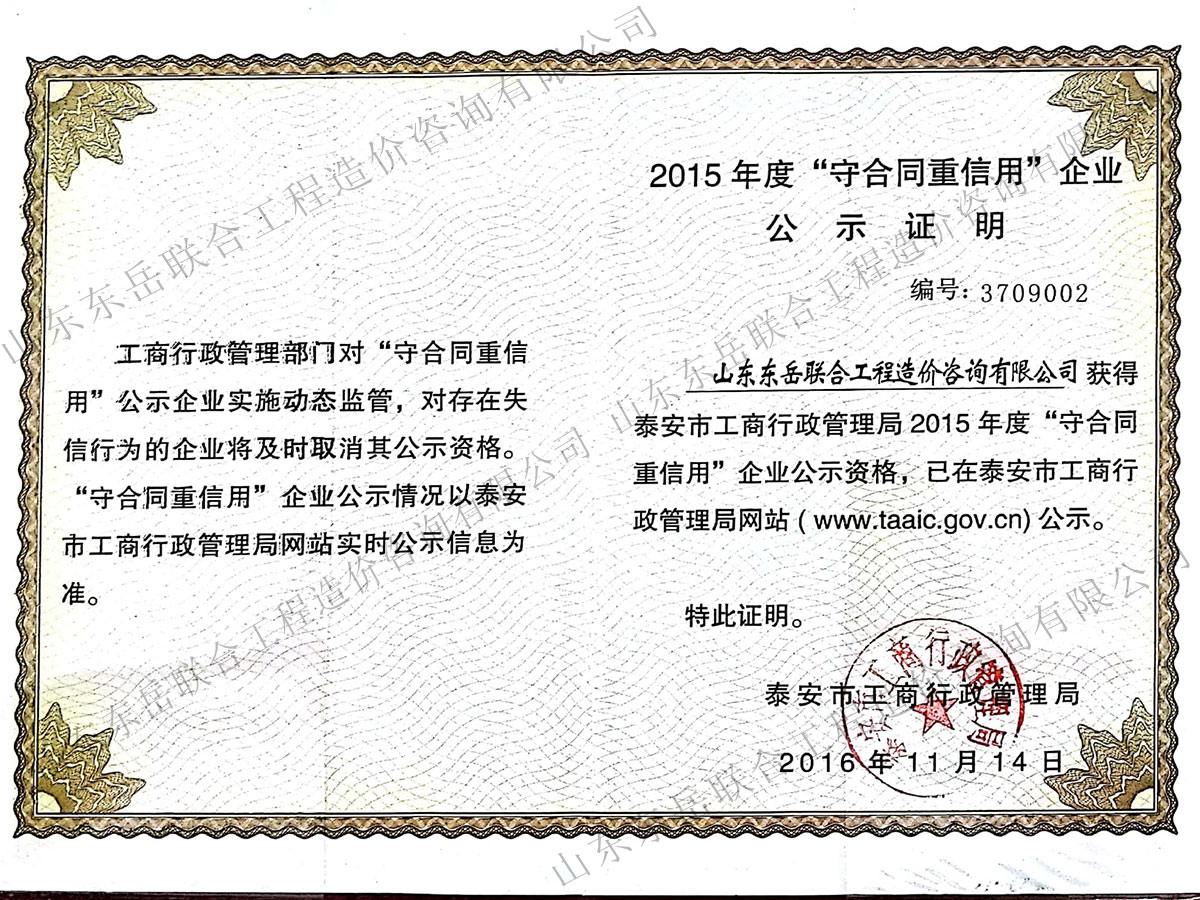 山东东岳联合资产评估有限公司获得省级“守合同重信用”企业
