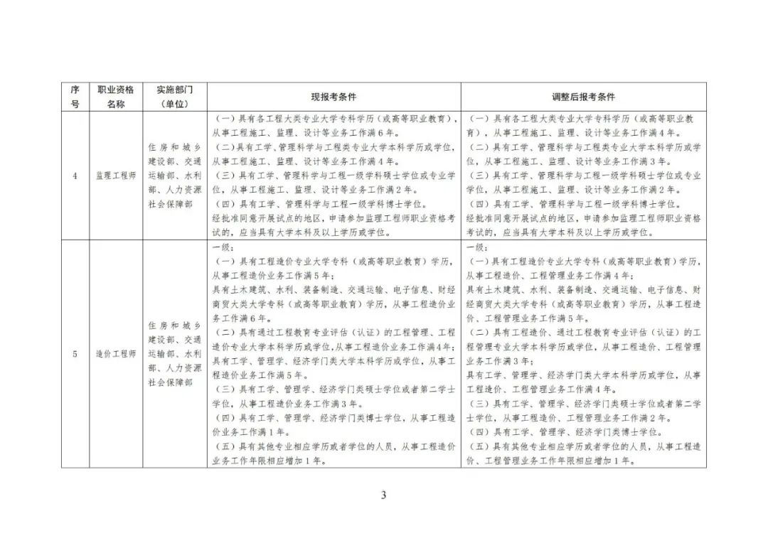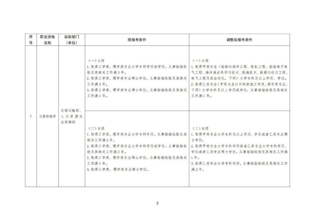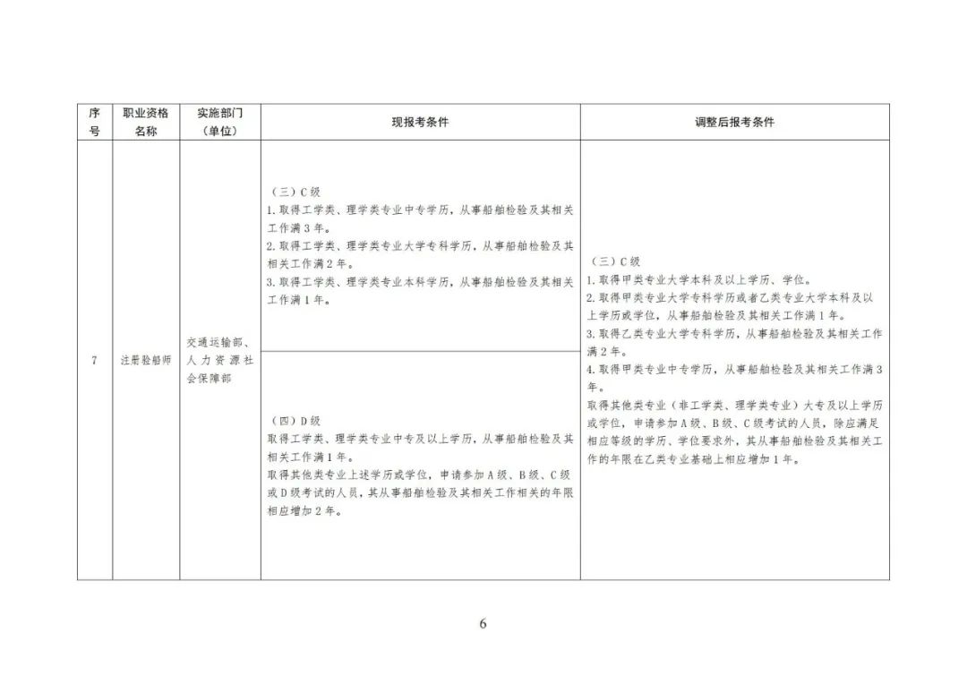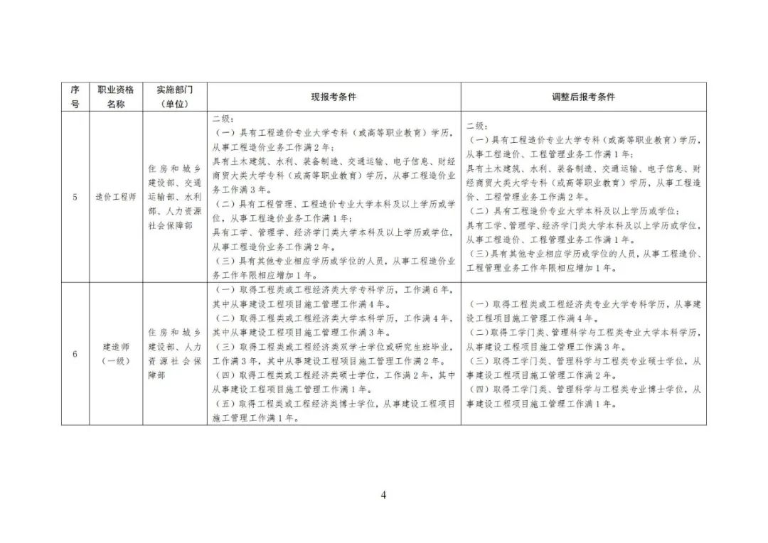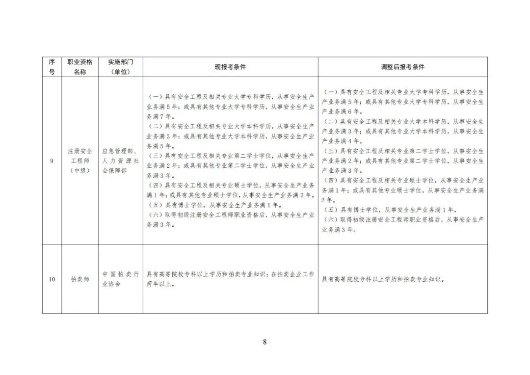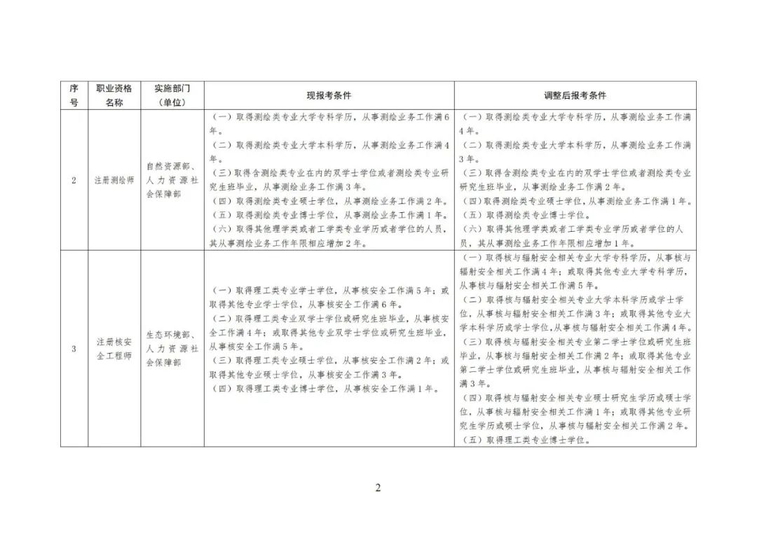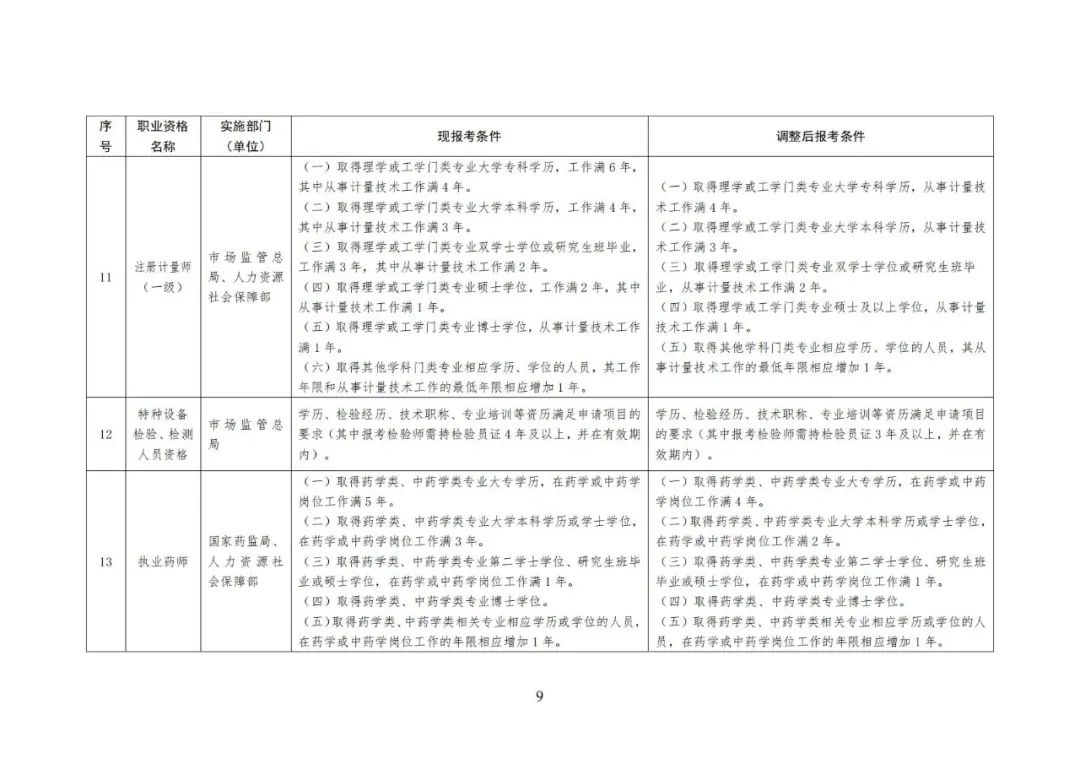 各省、自治区、直辖市人民政府,国务院各部委、各直属机构:根据国务院推进简政放权、放管结合、优化服务的改革部署,为贯彻落实《政府工作报告》要求,进一步推动降低就业创业门槛,经国务院同意,降低或取消《国家职业资格目录(2021年版)》中13项准入类职业资格考试工作年限要求。现就有关事项通知如下。一、《部分准入类职业资格考试工作年限要求调整方案》(见附件)自2022年起实施。除调整考试工作年限要求外,13项准入类职业资格的其他考试报名条件不变。二、各有关部门要按照本通知要求,抓紧修订相关部门规章,及时调整考试办法,做好政策宣传和舆论引导,让广大专业技术人员充分了解政策,确保政策落地落实。三、各地区、各有关部门要积极推行考试报名证明事项告知承诺制,依托全国一体化政务服务平台、国家数据共享交换平台,通过政府部门内部核查等方式对报考人员填报的信息进行核验,压减报考人员需提交的书面材料,进一步优化考试报名服务,减轻专业技术人员负担。四、考试工作年限要求调整后,专业技术人员取得的职业资格可继续按照有关规定与相应系列和层级的职称对应,并可作为申报高一级职称的条件。五、各地区、各有关部门要加强职业资格领域事前事中事后全链条全领域监管,严格制定考试大纲,认真履行命审题职责,在考试中加强对实际工作能力的考察力度,严厉打击考试违纪行为,强化对取得职业资格人员的专业能力评估和继续教育,确保政策落地后职业资格水平不降低。
