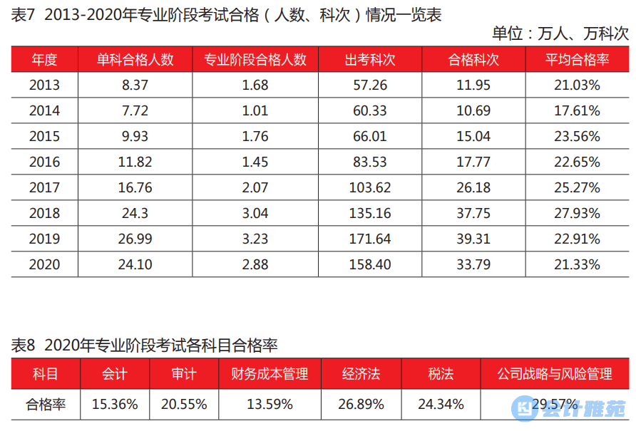 2020年专业阶段考试6个科目平均合格率为21.33%,比上年降低了1.58%。综合阶段考试有24353人通过并取得全科合格证书,合格率73.97%,比上年增幅2.08%。