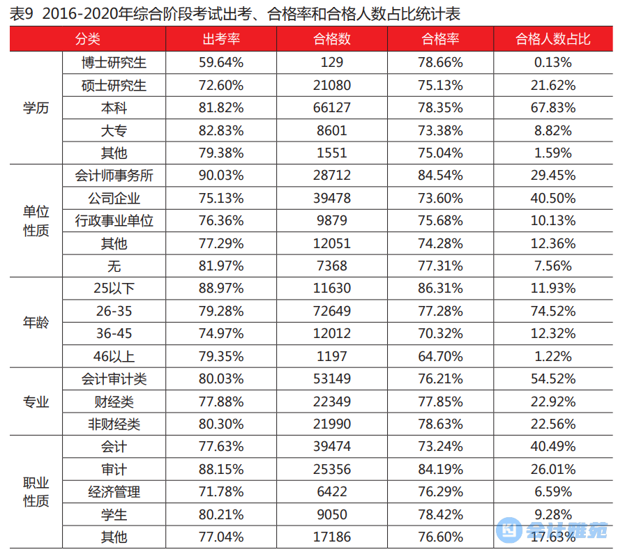 对2016-2020年取得综合阶段考试合格考生的学历、单位性质、性别等方面进行分析,发现其合格结果与考试的职业导向相符,表现为:具有本科学历的合格人数占比明显高于其他类别考生;会计师事务所的考生合格率最高;来自公司企业的考生由于报考基数大,合格人数占比最多;25岁以下考生合格率最高,26-35岁考生合格人数明显高于其他年龄段考生;会计审计类专业的合格人数占总合格人数的50%以上;从事审计工作的考生合格率高于其他职业性质考生。具体情况详见表9。