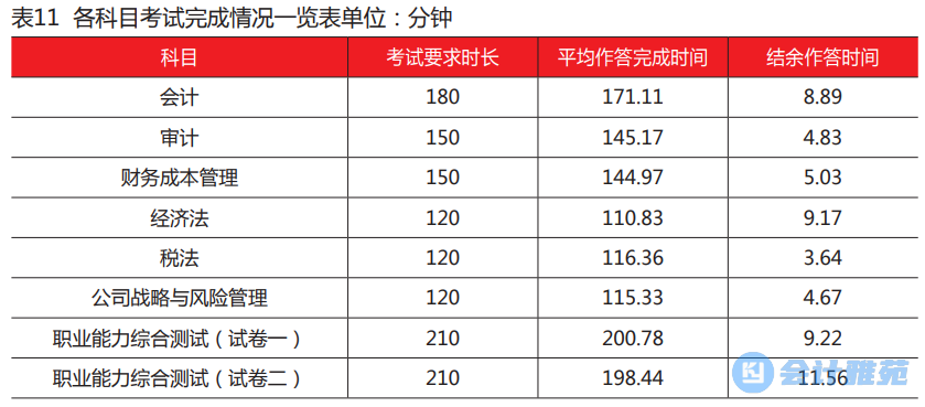 注会考试的题型有单选题、多选题、简答题、计算题、综合题和案例分析题。通过对考试平均作答完成时间统计,所有科目平均作答完成时间均未超过考试要求时长,表明考生能够在规定时间内完成考试,试题题量和考试时长设置合理。具体情况详见表11。