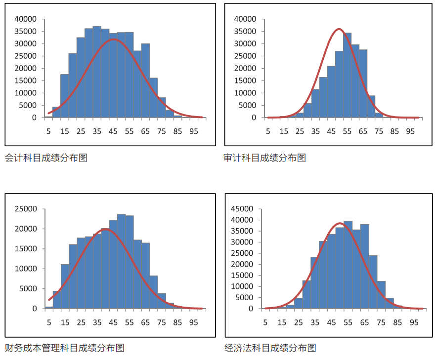 2020年专业阶段考试6个科目的峰度与偏度值均在-2和+2之间,表明考生成绩呈现比较合理的正态分布。具体情况详见图4、5。