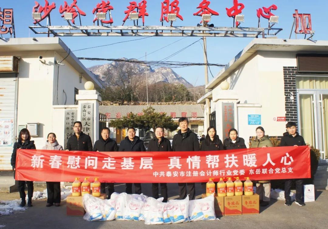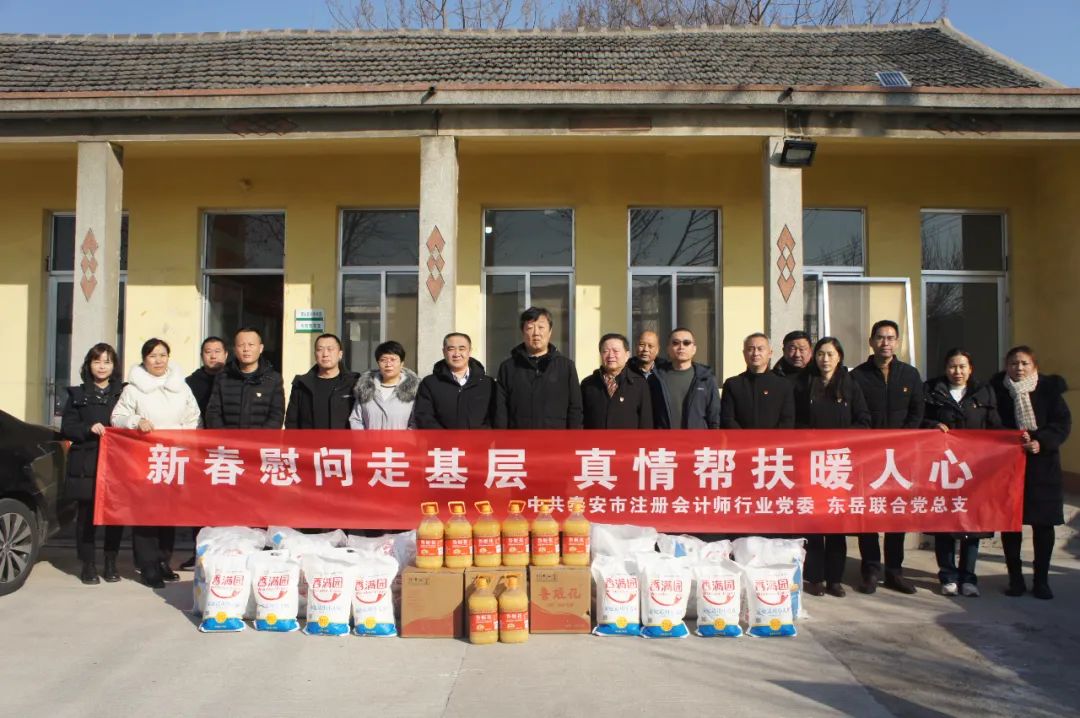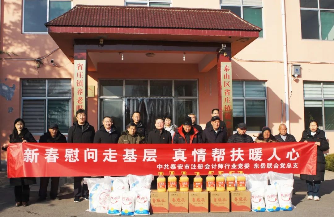为深入贯彻党的二十大精神,让广大人民群众深切感受到以习近平同志为核心的党中央的关怀和温暖,中共泰安市注册会计师行业党委、山东东岳联合服务集团党总支于2024年1月26日上午深入沙岭村、省庄镇养老院、省庄镇指挥庄村开展春节走访慰问活动,为困难群众送去新春的问候和关怀,以实际行动践行初心使命。泰安市财政局四级调研员张传清,山东东岳联合服务集团党总支书记张峰及党员代表参加此次活动。