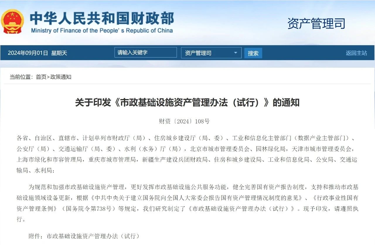 为规范和加强市政基础设施资产管理,健全完善国有资产报告制度,财政部、住房城乡建设部、工业和信息化部、公安部、交通运输部、水利部等六部门近日联合印发《市政基础设施资产管理办法(试行)》,自9月1日起施行。