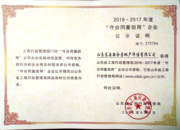 山东东岳联合房地产评估有限公司获得省级“守合同重信用”企业