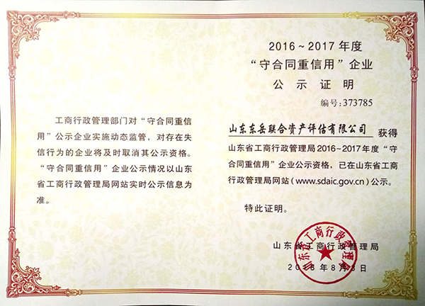 首页.公司荣誉. 山东东岳联合资产评估有限公司获得省级“守合同重信用”企业