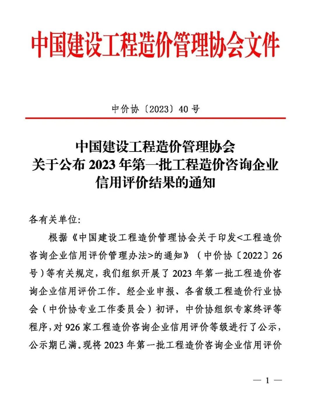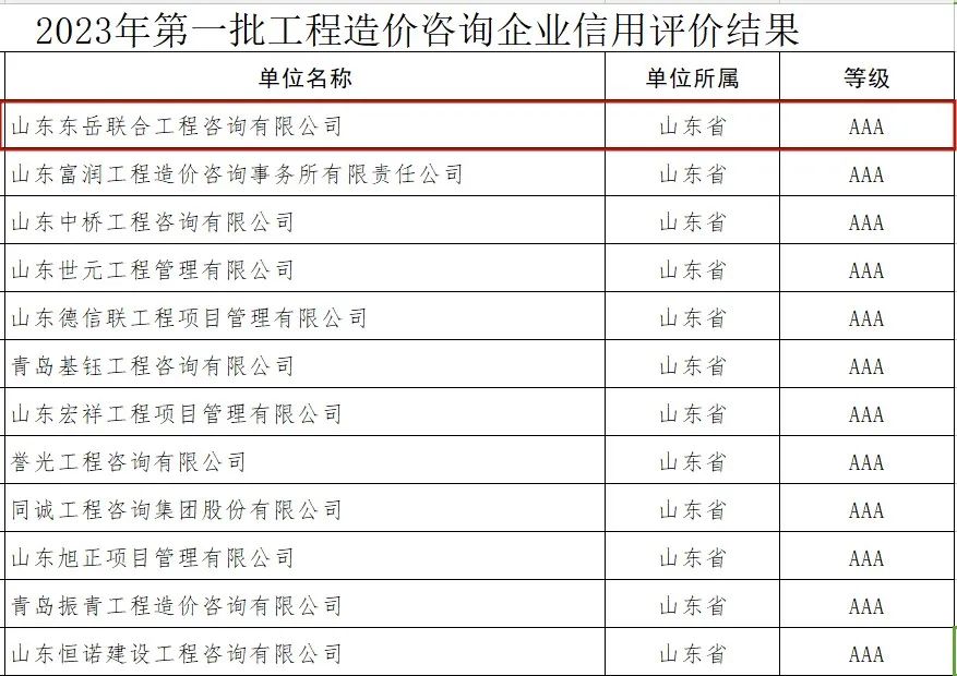 近日,中国建设工程造价管理协会(以下简称“中价协”)公布了2023年第一批工程造价咨询企业信用评价结果,经企业申报、各省级工程造价行业协会(中价协专业工作委员会)初评、中价协组织专家终评等程序,山东东岳联合工程咨询有限公司再次获评中价协工程造价咨询企业信用评价最高等级——AAA级。